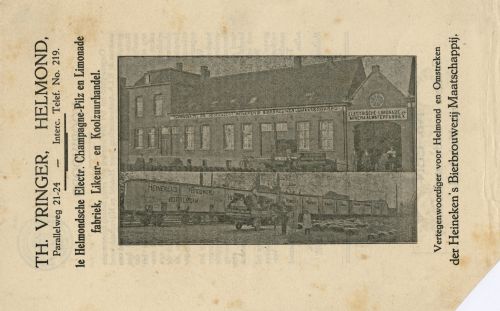 Het reclamepamflet toont een bloeiend bedrijf. Trots vertelt de firma dat het de 1e Helmondsche Elektr. Champagne-Pilz en Limonade fabriek, Likeur- en Koolzuurhandel is. Bovendien is het bedrijf vertegenwoordiger voor Helmond en omgeving van Heineken. Op het onderste deel van het pamflet is dan ook een aantal treinwagons van Heineken te zien die voor Vringer op het rangeerterrein staan. In februari 1934 overlijdt Theodorus Vringer. Zijn kinderen zijn nog op school of in opleiding. Maar zoon Arie, negentien jaar, zet het bedrijf voort. Dat het bedrijf uit een aantal woonhuizen bestaat is op het pamflet niet zo goed te zien. Dat wordt wel weer duidelijk op een foto uit de jaren ’60 waarop het rijtje te zien is in de jaren voorafgaand aan de sloop. Over de geschiedenis van deze panden een volgende keer meer.