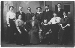 We hebben in onze collectie mooie foto’s van het pand, met de dames Hockers voor de deur van de winkel en in de ramen op de bovenverdieping. Maar ook een interieurfoto van de woonkamer. Deze foto laat zien hoe gegoede burgers in de jaren twintig en dertig hun huis inrichtten. De hier afgebeelde foto is echter een familieportret, dat volgens de omschrijving gemaakt zou zijn in 1914. Vader Petrus Fredricus Hubertus Hockers is dan al twee jaar dood. Het gezin Hockers bestaat dan uit moeder en acht kinderen, zes dochters en twee zonen. Op de foto staan zes vrouwen, vier mannen en een kind. Een van de dochters trouwt in 1914 en de tweede in 1915. Een zoon trouwt in 1921. Dit doet vermoeden dat de foto enkele jaren later dan 1914 genomen is, toen uit een van de huwelijken van de dochters al een kind was geboren, maar vóór de zoon trouwt.