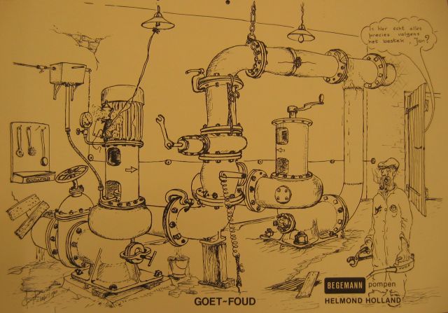 Over de vroegste geschiedenis van de pompenproductie bij Begemann heeft Giel van Hooff in 1999 een artikel geschreven in het blad Werkend Verleden in Helmond, dat uitgegeven wordt door de Stichting Industrieel Erfgoed Helmond. De pomp van het type 332 voor de Oud- en Nieuw Wateringveldsche polder wordt daar in niet beschreven omdat zij pas na die beginperiode gemaakt is. In het artikel wordt verteld hoe Begemann via de levering van stoominstallaties en ketels in aanraking kwam met de Engelse centrifugaalpompen en hij het belang zag van de groeiende markt voor die pompen. Nadat Begemann in 1882 werktuigbouwkundig ingenieur Grosjean heeft aangetrokken begint hij zelf met de productie van pompen. Wanneer dat precies is, blijkt nergens. Wel is bekend dat in 1885 een complete installatie, inclusief centrifugaalpompen wordt geleverd in Klundert. De pompen van Begemann bleken van goede kwaliteit. Het succes van de pompen maakte dat Begemann, behalve de unieke exemplaren ook pompen in serie ging vervaardigen. De pomp die vanaf deze week weer in Helmond te zien is van de serie 332. Wij kunnen u mooie foto’s laten zien van Begemann-pompen, maar U er nu een met eigen ogen aanschouwen. Daarom hierbij een cartoon die Begemann in het jaar 1980 heeft uitgegeven. Bij ontcijfering van de signatuur blijkt de tekening gemaakt te zijn door J. Cuijpers.